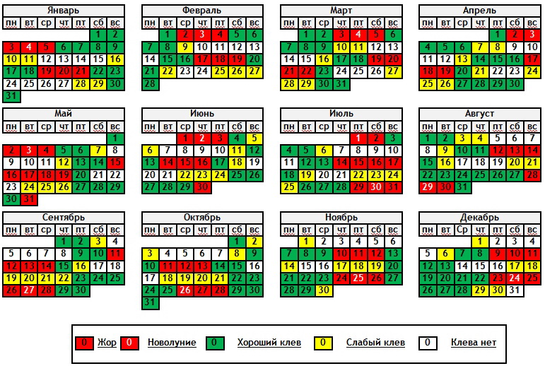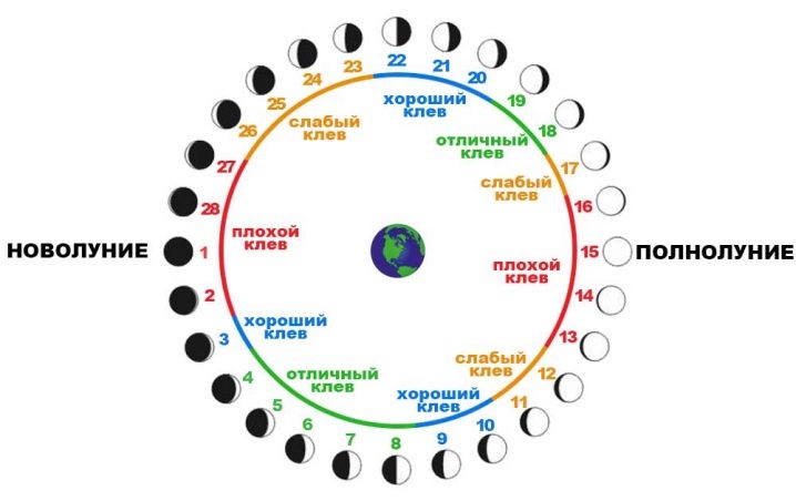 Замечено, что в течение лунного месяца существует два периода хорошего клева (хороший и очень хороший) и два периода плохого (плохой и очень плохой). Причем чисто погодными условиями эти спады-подъемы клева объяснить не возможно.