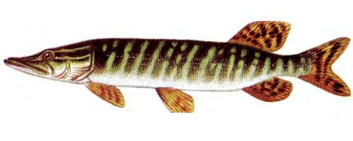 Отличить щуку можно по длинному телу, контрастным оранжевым плавникам и развитым челюстям. Тело окрашено в темно-серый или темно-зеленый цвет, покрыто светлыми пятнами, а у брюшка – короткими полосами.