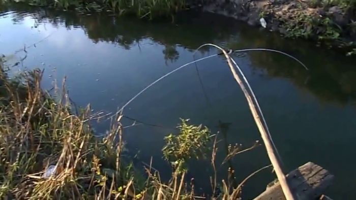 - Привязать к снасти веревку, благодаря которой можно вытягивать добычу. Другой конец можно привязать к пирсу, чтобы «паук» не уплыл. Еще можно поставить деревянный кол и на нем укрепить веревку.