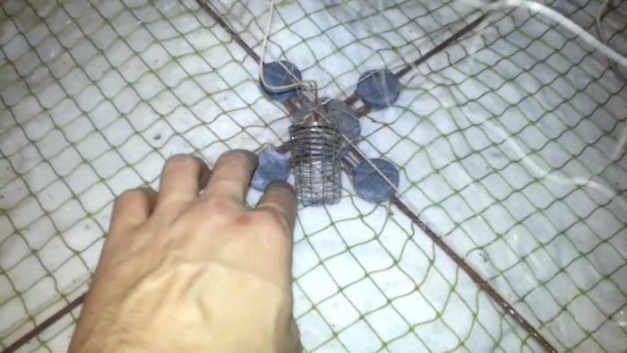 После этого следует согнуть концы прутов, и закрепить на них подходящих размеров кусок сети так, чтобы она лишь слегка провисала. Размер ячеи и толщину лески, из которой делают подъемник, подбирают под предполагаемый улов. Фабричный небольшой паук для ловли живца можно купить и в рыболовных магазинах.