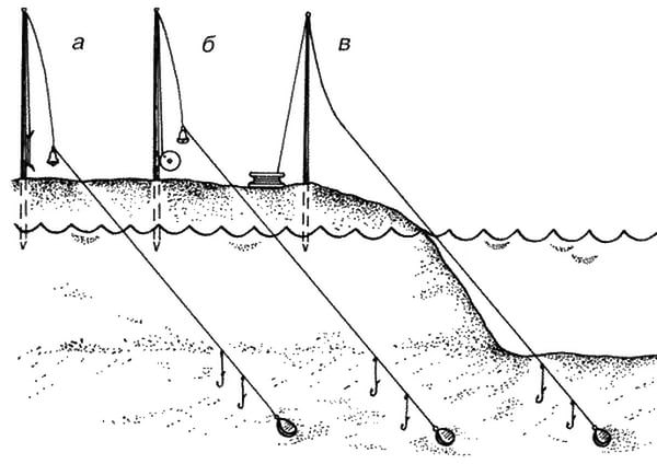 Использование переметов. Подобное оснащение отличается от остального наличием большого числа крючков. В этом случае один конец лески привязывают к грузику, второй – крепят на берег.