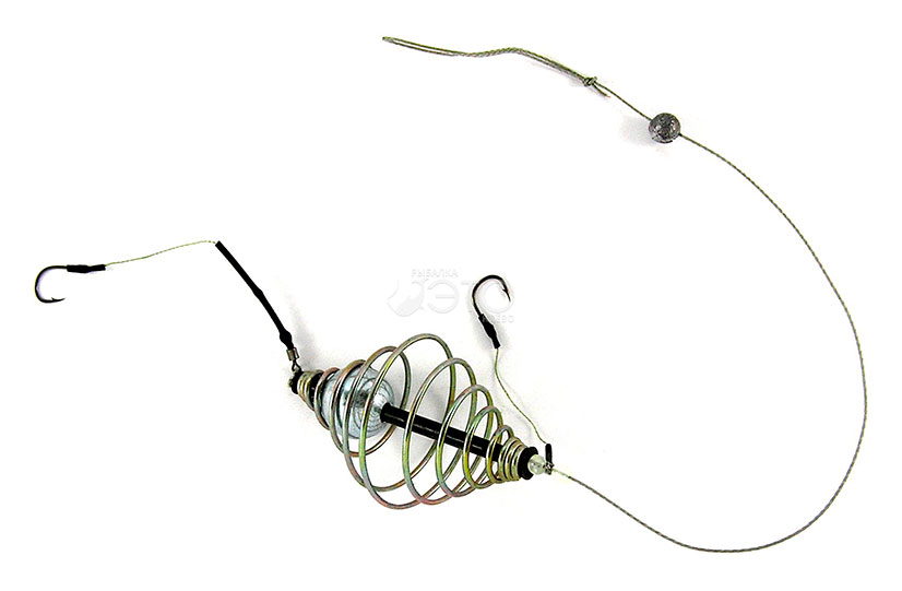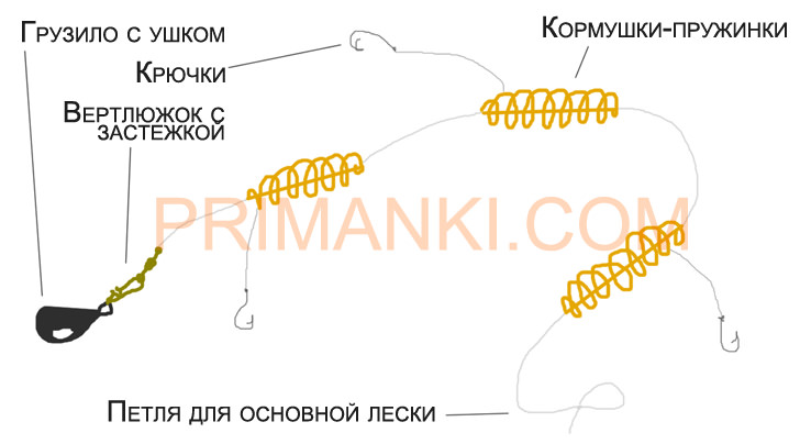 Обычно такую оснастку собирают на шнур или «стальку», диаметром до 0,3 мм. Между кормушками дополнительно ставят бусины или стопора, чтоб избежать захлеста между собой крючков. Поводки с крючками вяжут непосредственно над кормушками.