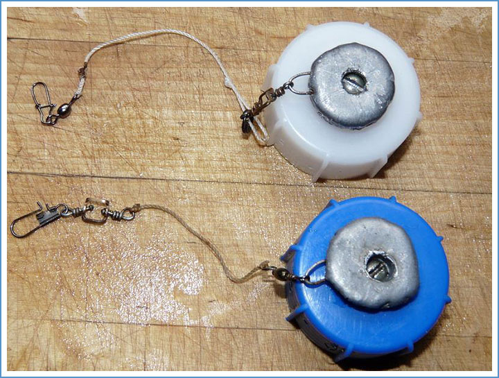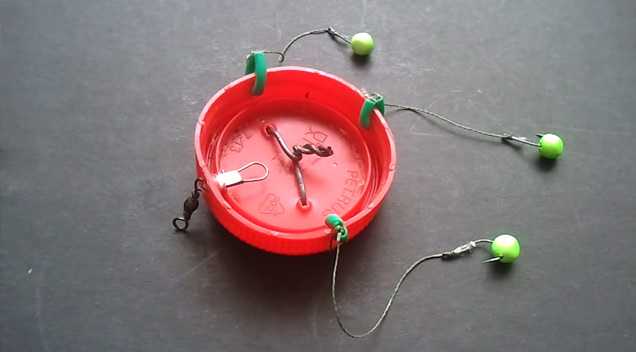Данный вид оснастки изготавливают из пробки от пластиковой бутылки, в которой пробиваются четыре отверстия. В середину вставляется крестовина с загнутыми ушками. При помощи одного из них самодельная кормушка крепиться к основной леске, а к оставшимся трем вяжут поводки с крючками.