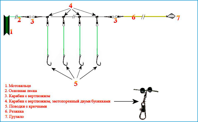 Оснастка имеет значительный вес и не дает чувствительного поклева – рыбе приходится тянуть всю снасть, а при малейшем сопротивлении она попросту самоподсекается . В магазинах продаются готовые монтажи, но можно собрать и самому.