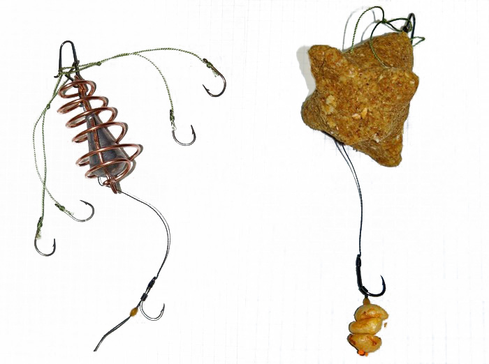 В кормушку забивается вязкая прикормка, в которую втыкаются крючки. В качестве прикормки, равно как и насадки можно использовать «пшенное тесто».