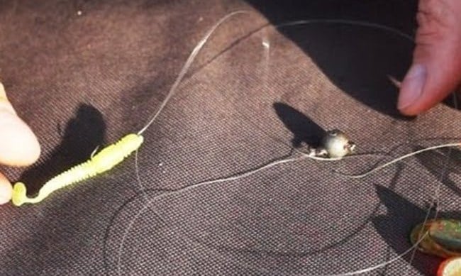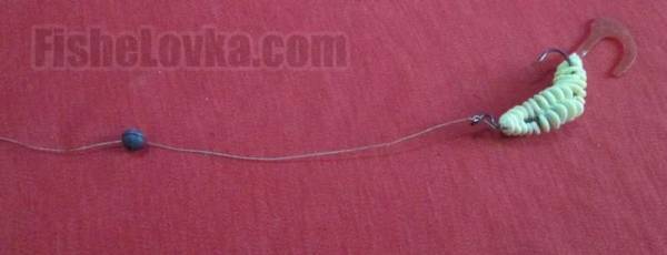 На основную леску крепится крючок с силиконовой приманкой, а выше него (до метра) зажимается свинцовая дробинка. Другая дополнительная фурнитура не используется.