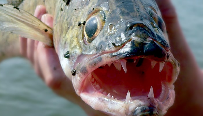 Кроме клыков, в пасти этого хищника находится много мелких, но исключительно острых зубов, что характерно для многих хищных рыб.