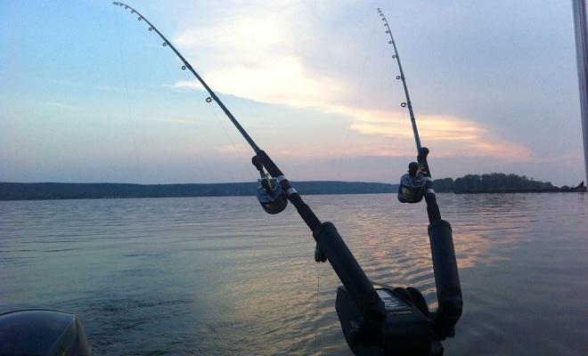Направив лодку по маршруту следования, надо закрепить удилища в держателях и последовательно опустить все приманки в воду. После погружения с катушки сматывается нужное количество лески.