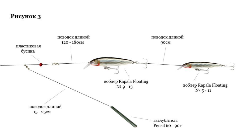При рыбалке троллингом применяют сразу несколько удилищ. При этом приманки ведутся на разной глубине. Внимание! Кроме проводок на разной глубине, изменяется и качественный состав приманок.