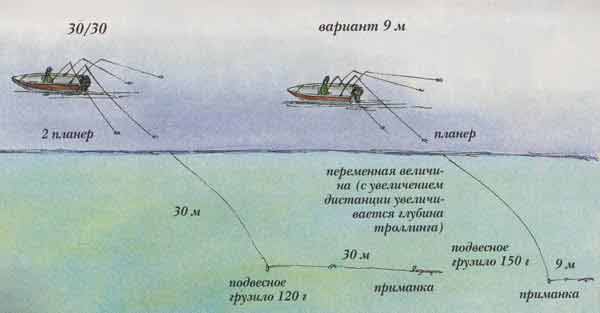 Заброс утяжеленных искусственных приманок позволяет проводить их троллинг на глубинах до примерно 10 — 15 метров. Для ловли на глубине 10 — 20 метров используется ныряющий планер, закрепляемый на расстоянии 2,5 — 4 метров от приманки.