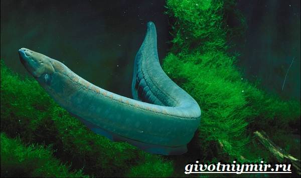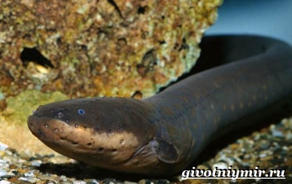 Эта рыба способна вырабатывать электрический ток, тело его змееобразное, а голова плоская. Электрический угорь вырастает до 2,5 м в длину, и имеет вес 40кг.