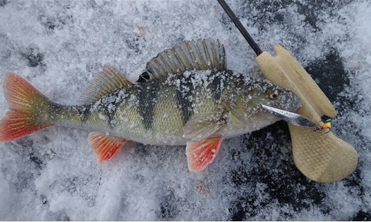- В начале зимы окунь лучше идет на мелкие блесны, постепенно их размер увеличивают