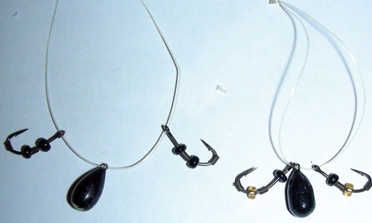 На конце лески вяжется петля, к которой крепятся грузило с крючками по бокам. Крючки должны свободно перемещаться по леске. Кембрики с бусинками одеваются на леску и крючки. Вес грузила зависит от глубины ловли и силы течения.