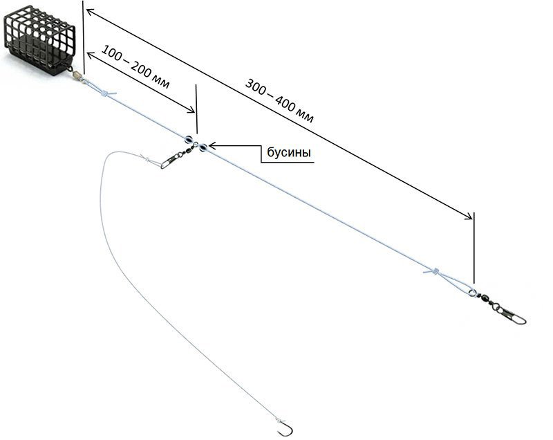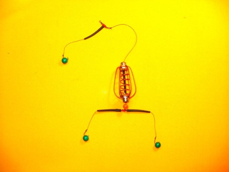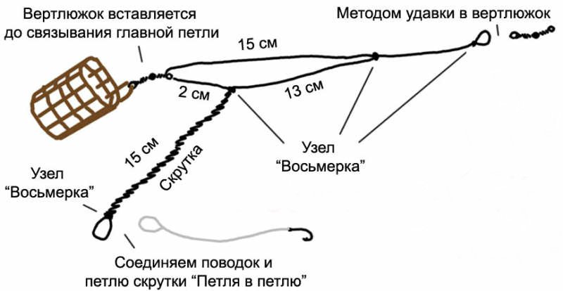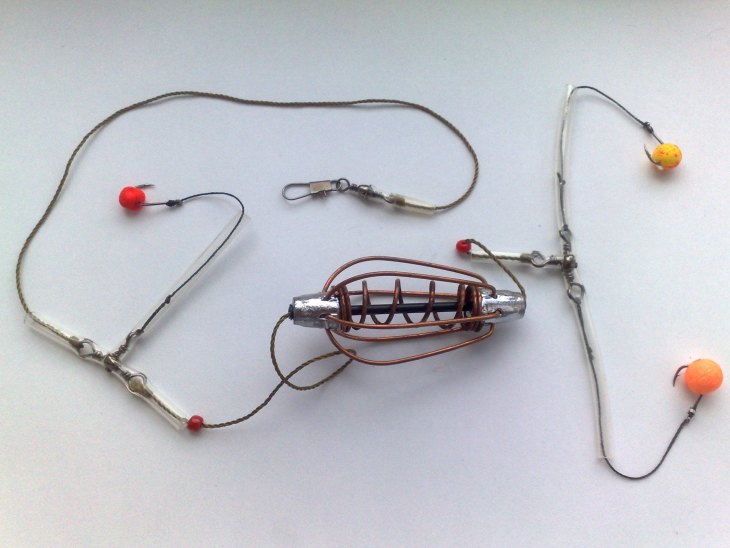 Также используется различные монтажи для крепления кормушки оснащенные только одним поводком с одним крючком.