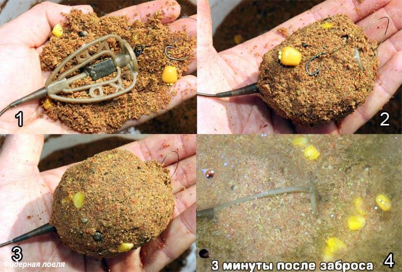 Для этого используются кормоемкие кормушки-сетки для фидера, способные доставить в точку большое количество корма. Прикормка прессуется в кормушку неплотно, чтобы сразу после попадания в воду она высыпалась в нужное место.