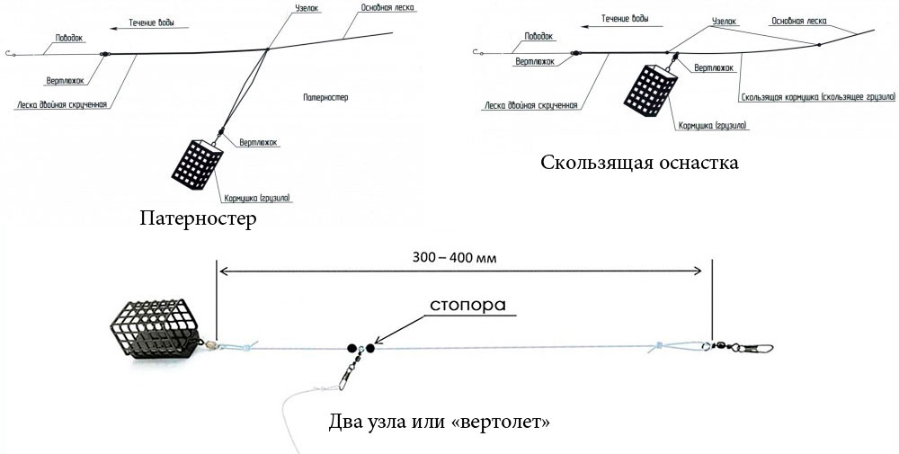 У фидерной оснастки существует несколько вариантов монтажа грузила, которые применяются в зависимости от условий ловли. Оснащают фидер только одним крючком.