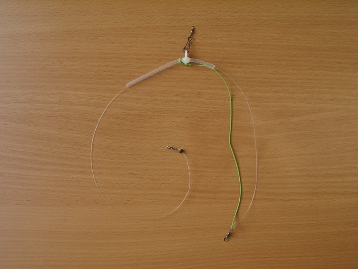 2. Вторая оснастка по простоте — это так называемая оснастка два узла или «вертолет». Применяют эту оснастку только для течения. Плюсы — быстро вяжется, простота, дает самоподсечку. Минусы — совсем не подходит для стоячих водоемов.