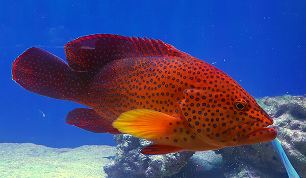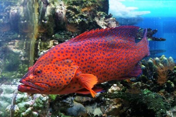Из-за размеров индоокеанский вид остается вне аквариумнистики. Для нее выбирается красный групер. Назван в честь окраса. Он оранжево-алый. На основном фоне расположены бирюзовые «горошины».