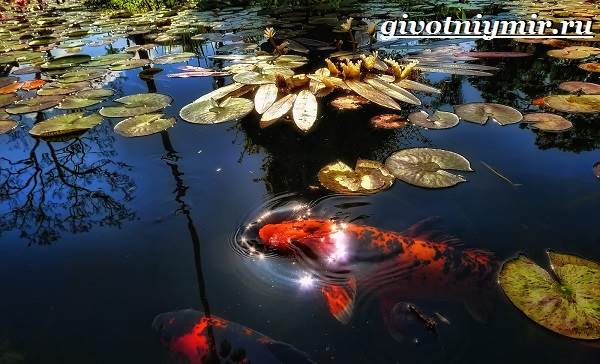 — кои, декоративных карпов. Разводились с 14 века в Японии и отличались сначала красным, черным и желтым окрасом, позже получены разновидности необычных и причудливых расцветок: белый карп, полосатый, с узорами на спинке и другие виды.