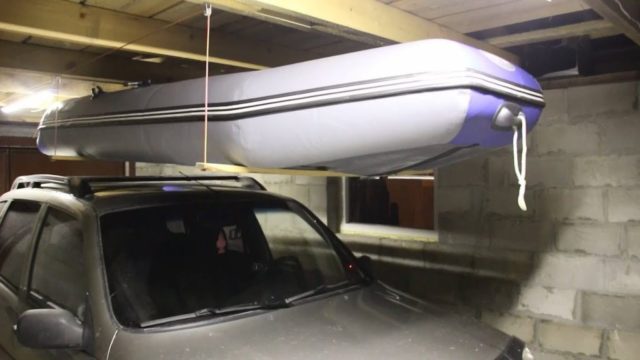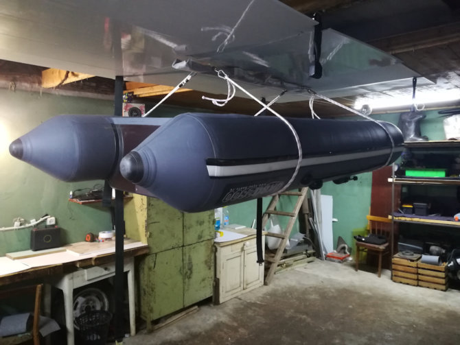 В холодное время и летом плавательное средство ПВХ лучше расположить под потолком гаража