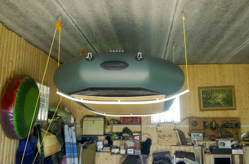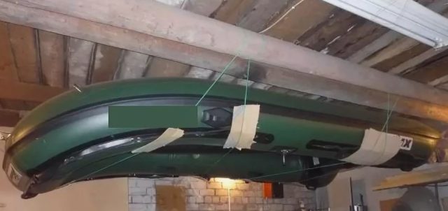 - Спустить воздух, оставив лодку ПВХ немного надутой. Подвесить под потолок в гараже или другом хозяйственном помещении.