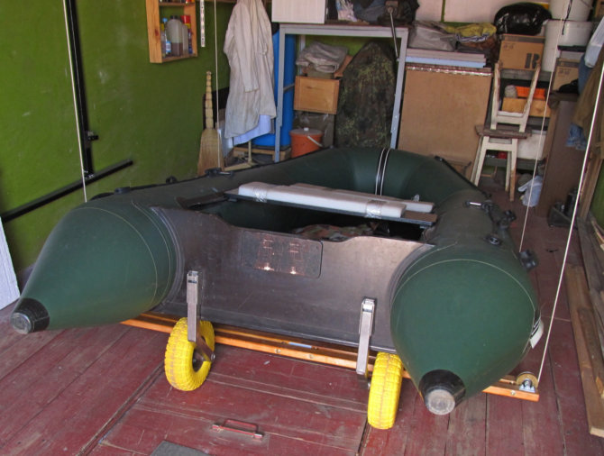 - для хранения неплохо подходит лодочный прицеп — сверток с аккуратно сложенным ПВХ катером можно просто положить на его дно;