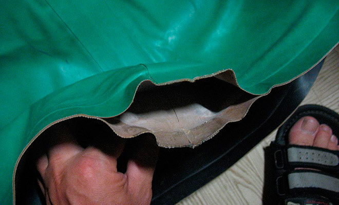 Если разрыв 1-3 сантиметра в диаметре, наложите резиновую заплатку сверху, обработав края клеевым составом.