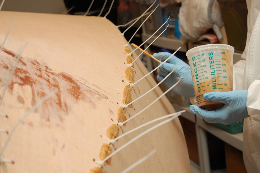 Далее приступаем к проклейке швов. Для этого стеклоткань пропитываем эпоксидной смолой, а поверхность под поклейку грунтуем.