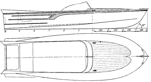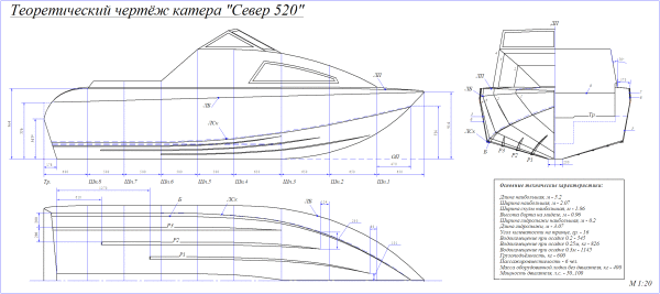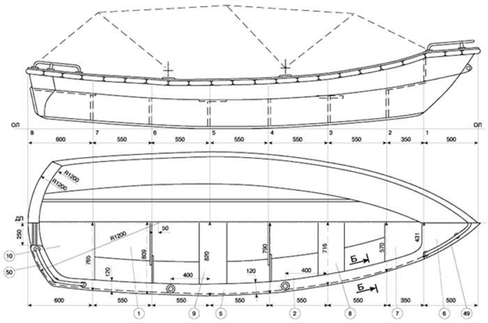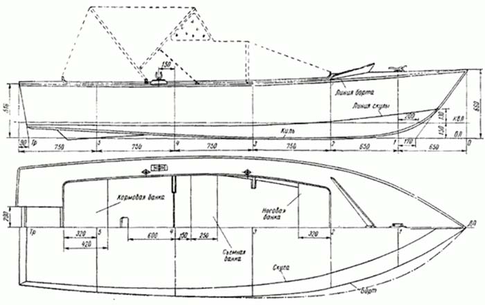 - вычерчивается вертикальная проекция лодки и проекция вид сверху;