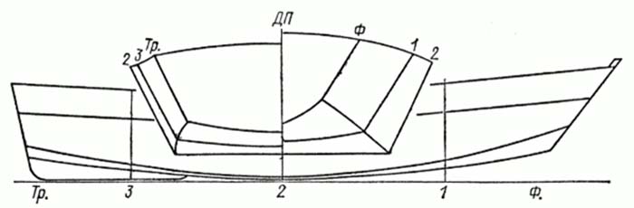- диаметральная плоскость (ДП) делится на одинаковые отрезки, это будут места расположения шпангоутов;