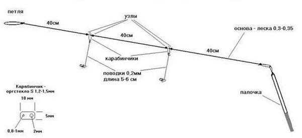 В этом случае вам рекомендуется установить один или же несколько коротких поводков, которые привязываются перед палкой на некотором расстоянии. Причем общая длина проводков не должна быть больше длины самой трубки. Наживки стоит выбирать наименьшего веса. В противном случае смысла делать такого рода оснастку нет.