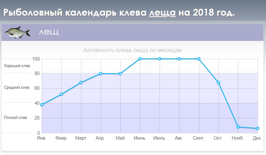 Летом лещ ловится очень хорошо. Если посмотреть не рыболовные календари, то мы увидим, что все месяцы, напротив леща закрашены красным. Это и не удивительно, ведь летом он успевает набрать хороший вес перед холодами. Если взглянуть на скорость роста леща, то по этому параметру он уступает лишь карпу и сазану.