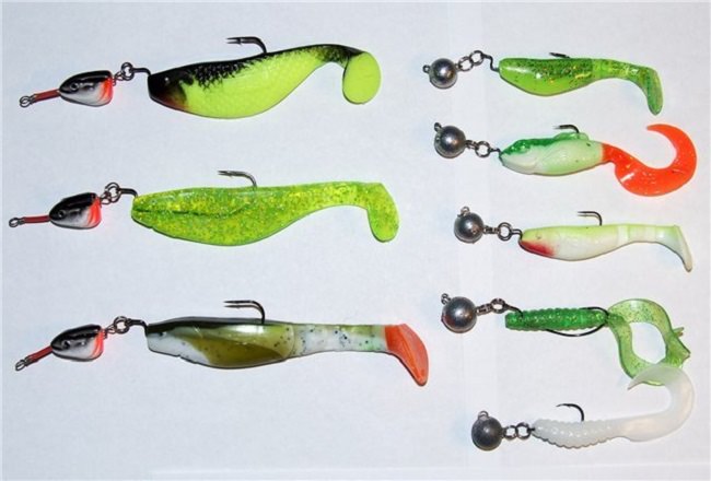 Наибольшей популярностью в джиг-ловле пользуются заводские приманки- твистеры, которые выглядят как пиявка с подогнутым хвостом, а также виброхвосты — это небольшие рыбки из силикона с широким хвостом. Далее по популярности идут рыбки из поролона.