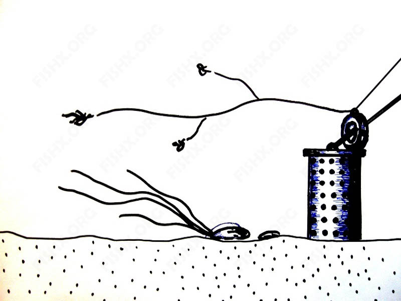 Настраивалось все это таким образом: в сетку кормушки набивали сухари или хлеб и опускали на дно. Конец веревки закрепляли в лодке. Далее на эту веревку через разъем надевали скользящее металлическое кольцо с поводками и спускали его к кормушке.