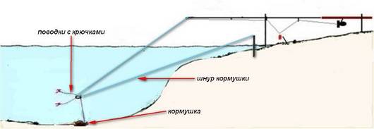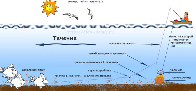Когда лодка надежно установлена на двух якорях (желательно поперек течения), можно забрасывать снасть. Сначала на дно медленно опускают кормушку с кормом и натягивают удерживающую ее толстую мононить.