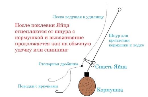Когда-то ловля таким методом была строжайше запрещена, и вот тогда изобрели яйца. Весьма легко отсоединяющиеся при ловле, они умалчивали об использовании кормушки от остроглазых инспекторов рыбников. Убеждая их, что человек попросту рыбачит на донную удочку.