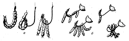Насаживание мотыля пучком. Разновидности этого способа применяются при лове крупной рыбы и использовании достаточно больших крючков. Раньше (да нередко и теперь) мотыля связывали в пучок по 8-10 личинок простой ниткой, который затем и накалывали на крючок или мормышку.