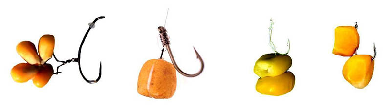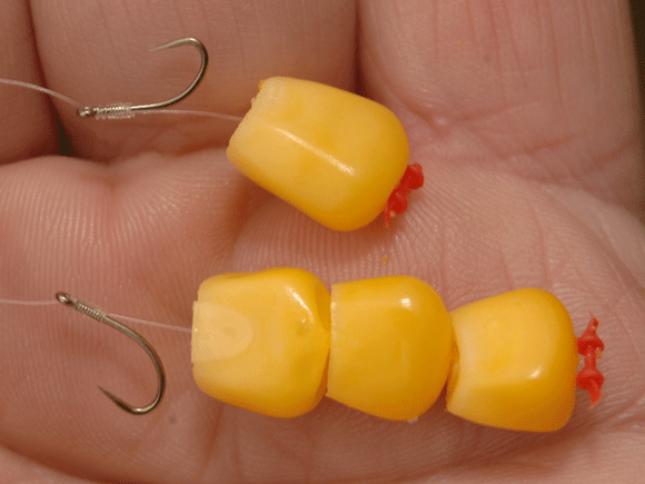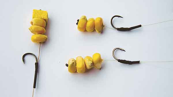 - нескольких зерен кукурузы насаживают для ловли крупной рыбы. При использовании нескольких зерен появляется гарантия, что мелкая рыба не сможет сбить или съесть всю приманку, а для крупной насадка становится более привлекательной.