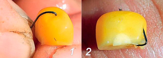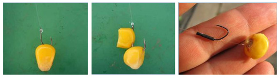 Во всех случаях насаживают таким образом, чтобы жало крючка несколько выглядывало из приманки. Вполне возможно, что рыба может обнаружить вовремя крючок и отпустить наживку, но, как показывает практика, больше рыбы не зацепляется за крючок из-за того, что при подсечке крючок не успевает пронизать зерно кукурузы и рыба успевает выплюнуть крючок с наживкой.