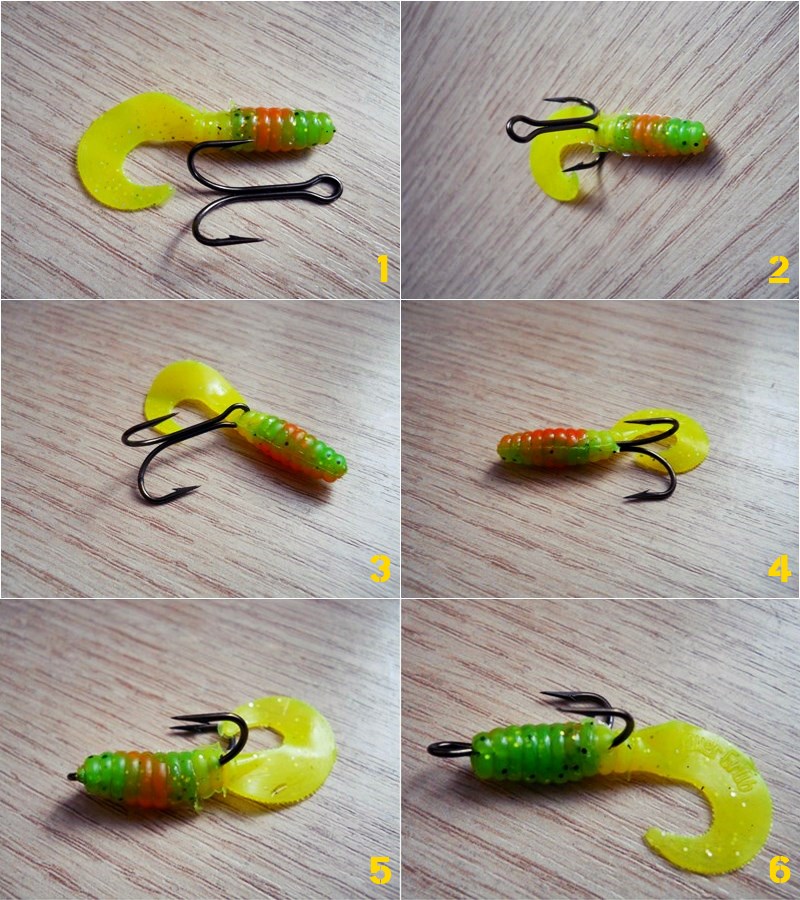 Варианты снасти на виброхвост, кроме джиголовки, не исключают использование в деле также и двойные (офсетные) и даже тройные крючки, но монтаж такой вещицы будет куда более проблематичным. Для этого лезвия нужно аккуратно продевать одно за другим, во избежание порчи приманки.