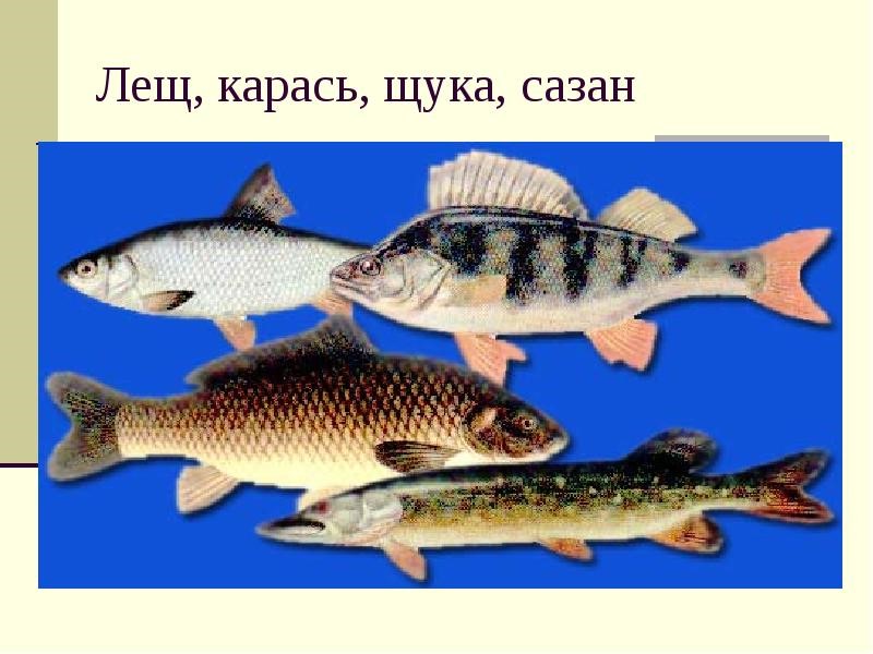 Чаще других встречаются: щуки, караси, густера, белоглазки, окуни, судаки, сомы, сазаны, лещи, голаль, синец. Чуть реже — красноперка, плотва, карп, угорь, тарань. сельдь, килька, пузанок, стерлядь, линь, берш, белый амур, вьюн, плотва, голавль, жерех, чехонь, подуст, налим, елец, шемая, уклейка, пескарь, бычки, толстолобик.