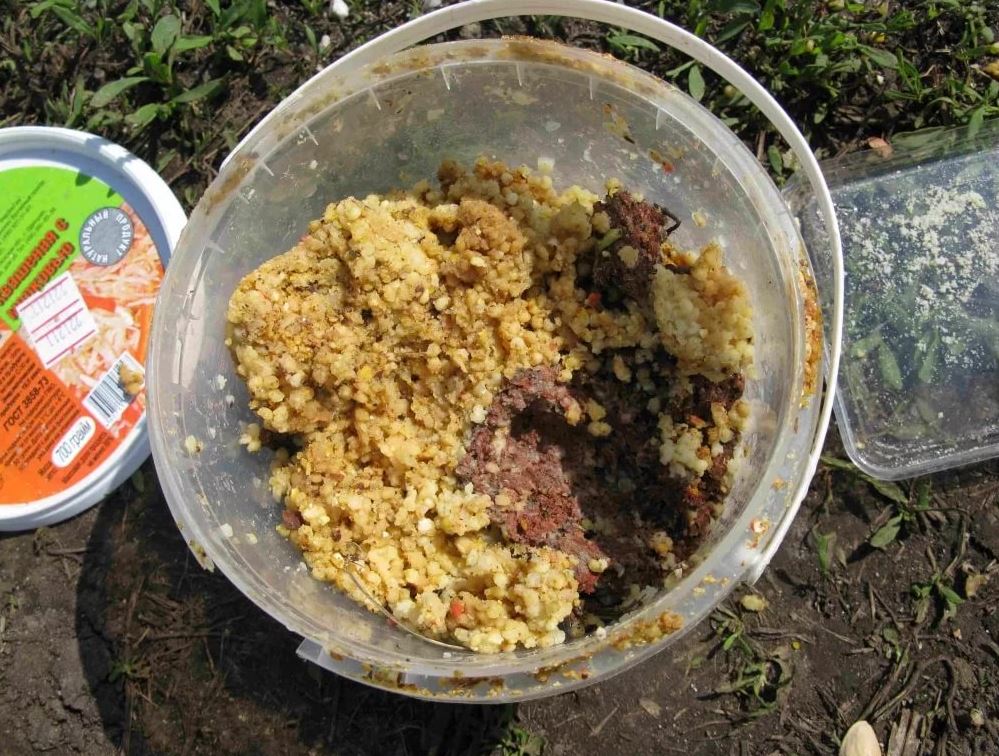 Это могут быть различные каши в разных сочетаниях и вариациях, или обжаренный в не рафинированном масле ржаной хлеб, рубленый червь и опарыш, скатанные в шарики с использованием песка и глины, и много ещё чего другого. Но если нет времени и желания на подобные эксперименты, то всегда можно купить готовую смесь для прикормки.
