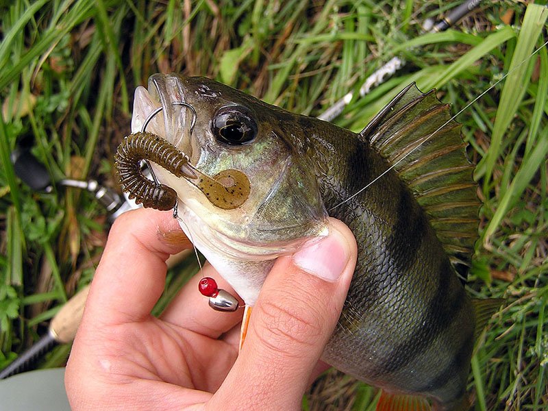 Ловля окуня на силиконовые приманки с запахом воспринимаются рыбой как съедобные. Обычно окунь не заглатывает наживку полностью, а понемногу пробует ее.