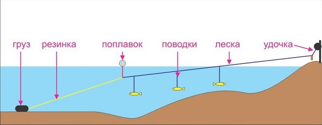 - Резинка представляет собой стационарную снасть, у которой имеется сразу несколько крючков. Таким приспособлением можно обеспечить улов на любых водах.