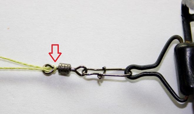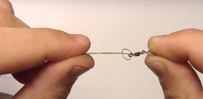Самый распространенный метод привязки глухим способом – удавкой петлей в петлю. Сделать это можно как через вертлюжок, так и без него прямо в ушко крепления кормака.