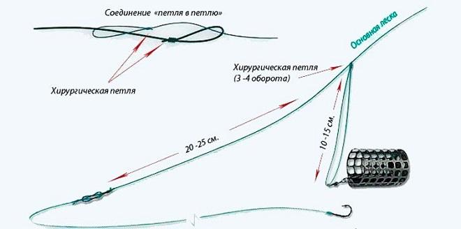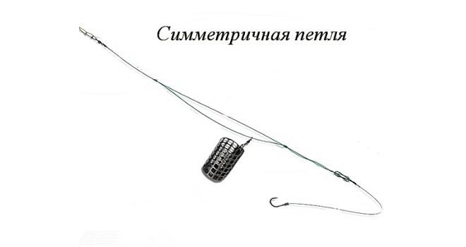 В симметричной или несимметричной петле установить кормушку фидера нужно так, чтобы она бегала свободно по одному из плеч связки. Во время поклевки рыба вытягивает леску через ушко, пока та не достигнет верхнего узла.