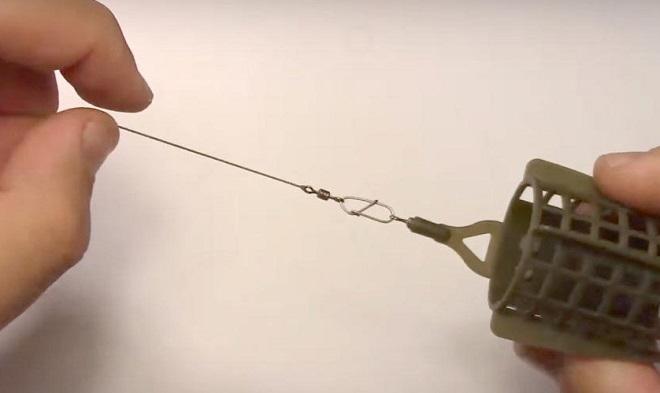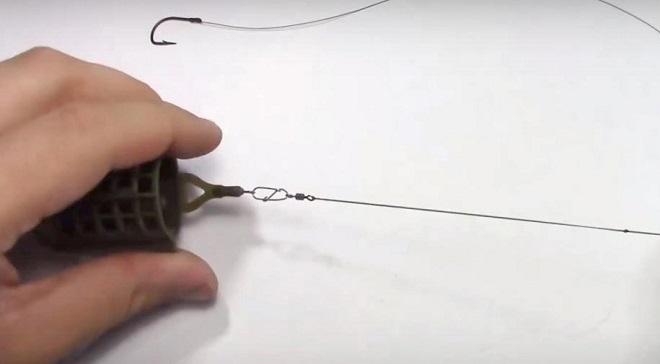 Правильно привязать фидерную кормушку проще всего через двойку карабин плюс вертлюжок. Связку с застежкой привязываем к отводу любым способом – узлом, удавкой, в петлю через вертлюжок.