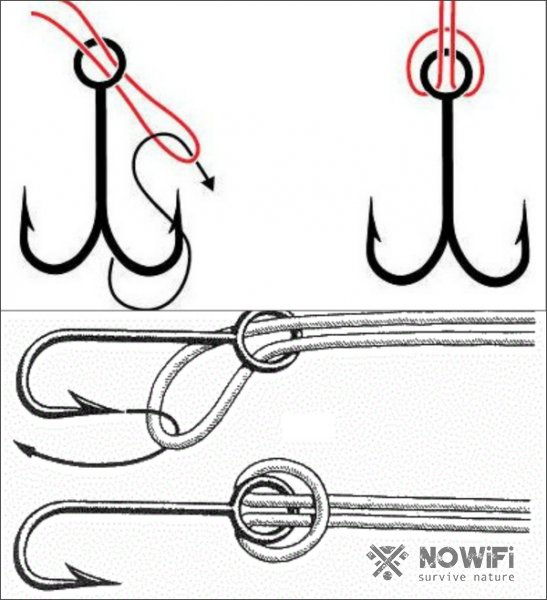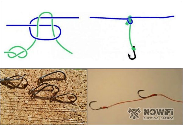 Чтобы привязать второй крючок к леске можете воспользоваться одним из нескольких рецептов, приведёных ниже. Это либо привязка крючка непосредственно к леске, либо путём присоединения его с помощью поводка.
