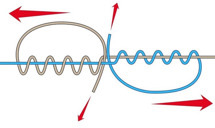 - После обкручивания в количестве шести раз одной лески вокруг другой, следует пропустить оставшийся конец между этими же лесками.