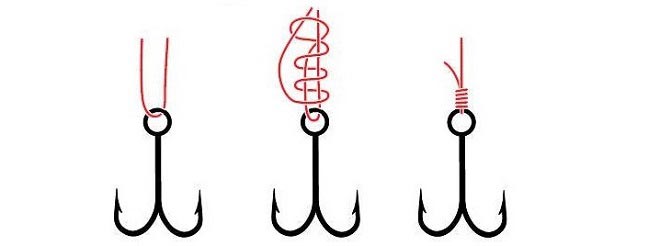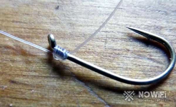 Привязка основного крючка выполняется аналогично первому. Надо протянуть леску в ушко крючка, оборачивая несколько раз ее вокруг цевья. А в завершение противоположный конец завести в это ушко с другой стороны.